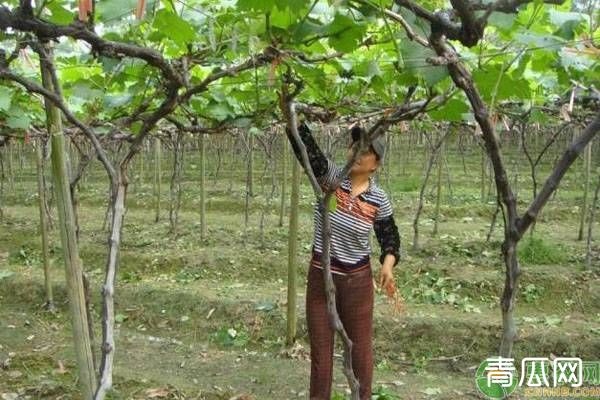 绑蔓工作必须根据整形的要求进行。冬季修剪后,就要进行绑蔓,以后随着新梢的生长,不断进行绑蔓,绑蔓的方法采用“8”字形扣,打扣时不宜过紧,以免绞缢。