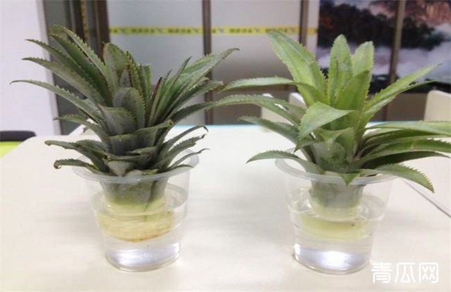 去掉菠萝头的烂叶子、嫩叶子,然后在阴凉通风处晾干切割伤口,没有汁液以后才能浸泡在水中,不然容易腐烂,水中适当添加营养溶液可以促进生会根。容器都要清洗干净,消毒处理以后使用。注意只要肉质部接触水面,叶子不能接触,会腐烂。