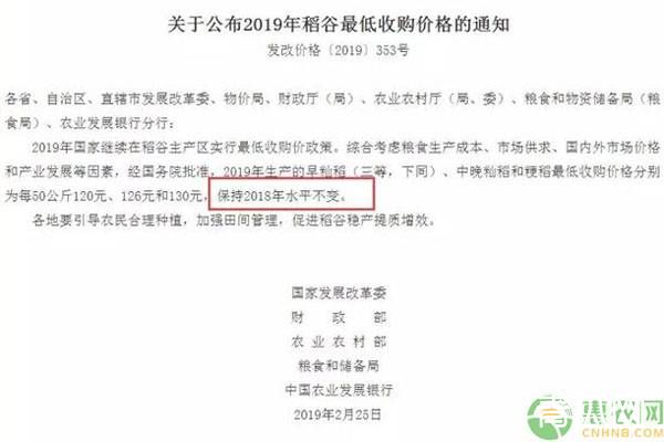 早在2019年2月26日,国家发展改革委、财政部、农业农村部、粮食和储备局、中国农业发展银行五部门联合公布了2019年稻谷最低保护价,2019年还是继续在稻谷主产区实行最低收购价政策。综合考虑了粮食生产成本、市场供求、国内外市场价格和产业发展等因素,经国务院批准,2019年生产的早籼稻(三等,下同)、中晚籼稻和粳稻最低收购价格分别为每50公斤120元、126元和130元,保持2018年水平不变。